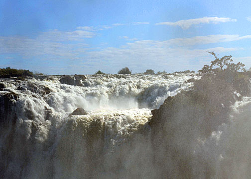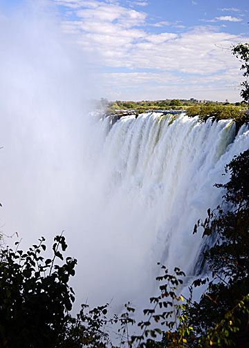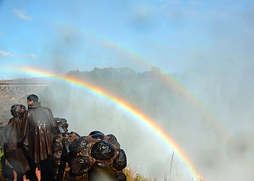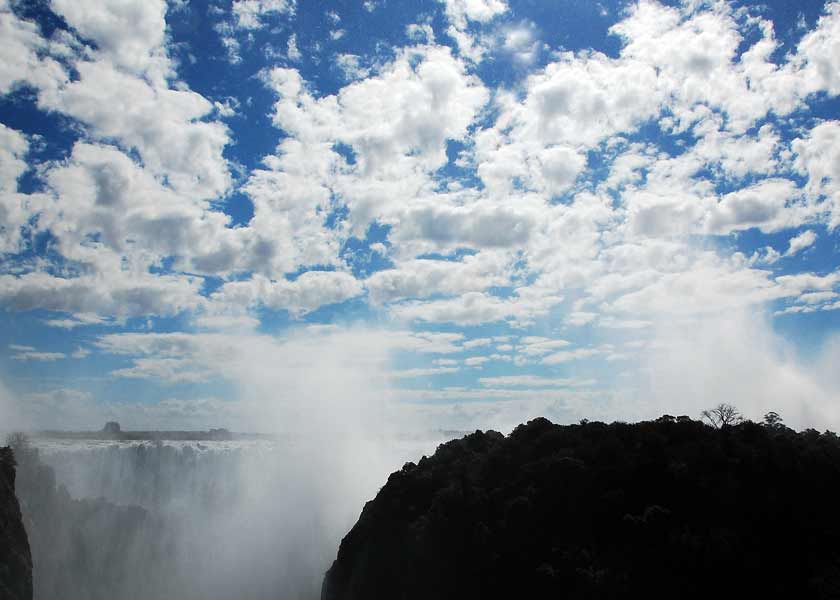This morning we finally visited the constant background roar we have listened to since our arrival at the campsite: Victoria Falls – Mosi-oa-Tunya, “The Smoke That Thunders” (http://en.wikipedia.org/wiki/Victoria_Falls). When you first see the falls, it’s definitely one of those, “mere words just fail me moments”. It’s just freakin’ awesome; the unimaginable amounts of water flowing over the precipice, the sheer physical presence of the roar of the falling water, and the spray… omigod! Did I say spray? At times it was literally like someone soaking you down with several garden hoses… from ALL directions all at the same time – up, down, and from all around! I had a rain shield for my camera; but even with that, the front of my lens got hit with so much water that there was actual liquid water (not just condensation) under and between my filters!