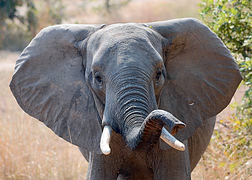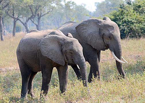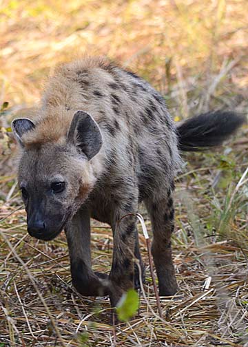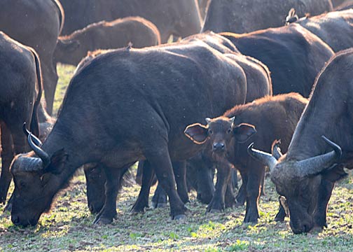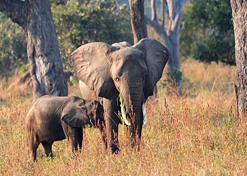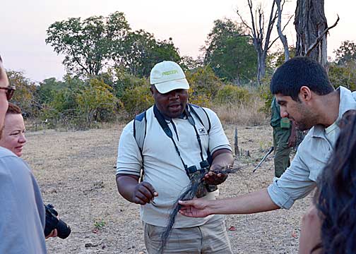 At 4 PM, Big Joseph picks us up for our evening Game Walk and Game Drive. Along the way, we pick up James (our Field Guide for the evening) and David (our protection for the walk). David has been working in and around this park for more than two decades and carries an old but well-maintained CZ 550 Magnum bolt-action repeater with open sights. It is chambered for the rather serious .375 Magnum round and he loaded it with a combination of solid copper rounds (for maximum penetration – Cape Buffalo and Elephants) and copper-jacketed lead rounds (for maximum expansion – the large cats and Hyaena). Walking about on foot in this park is a wholly different experience than being driven through it; driving in the park feels like you’re sight-seeing, being on foot gives you a completely different, if not more ominous, perspective. The sound of your own footfalls, your limited vision due to the tall grass and bushes, the cries of the birds, the noises of the insects, the smells of the African wilderness (including the sporadic waft of “dead things”), and the spoor and dung of a variety of animals visible in all directions… this was the real “Great White Hunter”safari experience! We spotted many different animals this evening; including Kudu, Bushbuck, and a small family group of Elephants (a mature female, and adolescent, and a yearling). It was simply an amazing experience to be able to track this group by foot. It is also interesting to note that the majority of animals reacted to us very differently; in a vehicle, we could approach very close (sometimes ridiculously so) because the truck was not considered a threat-source. However, on foot, the vertical profile of humans triggers an instinctual perception of a threat – the animals see walking humans as “hunters” and become very wary of our approach.