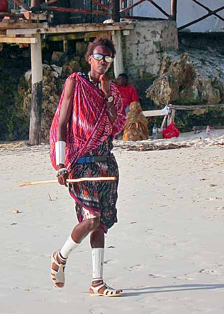 Young Maasai, in full traditional dress, cruise the beach sporting sunglasses and cell phones while hawking beaded jewelry and village tours.