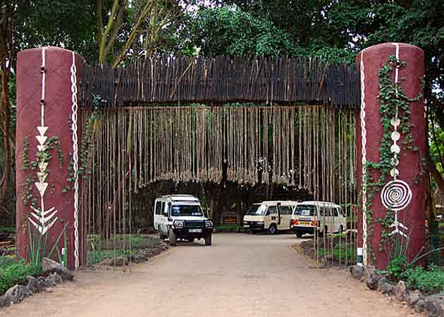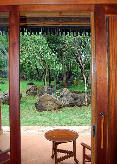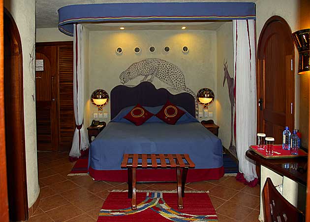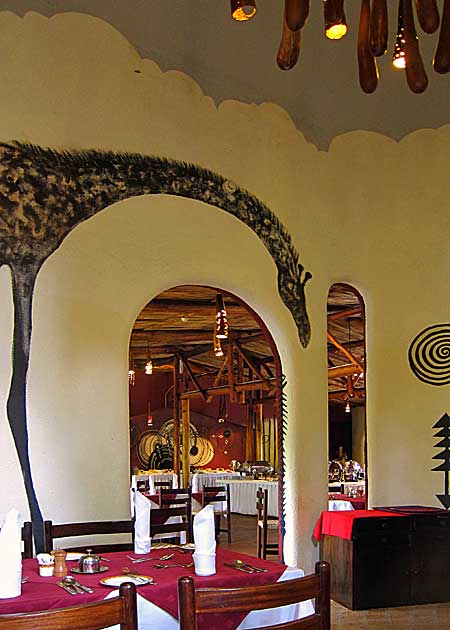 Our room is luxury hotel meets African game lodge. The walls are painted with murals of wildlife and tribal themes, the decor utilizes Maasai beading, carvings, and spears. Dark African woods are used for the desk and beside tables. The bed is elegant with down pillows and a real duvet. The whole bed is surrounded by a track-mounted mosquito net. The room is completed by a small patio with chairs and table, and has a view of the exquisite gardens. The only downside is that you must remember to close the screen door because the resident vervet monkeys will raid the room given any opportunity.
