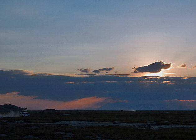 After lunch and a siesta, Patrick took us on a late afternoon game drive. Just before sunset, we spotted Kilimanjaro’s peaks, and stopped to shoot photographs. That is twice we have been able to see Kili… How ’bout that, Brett?