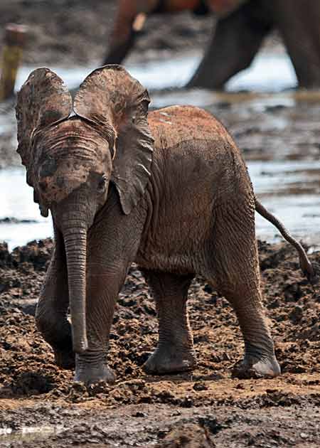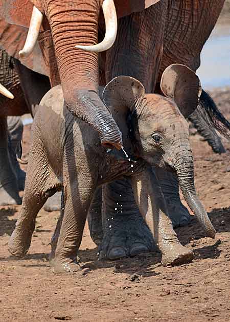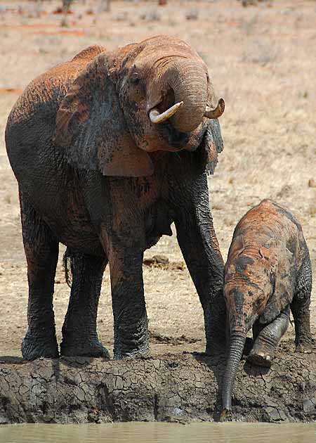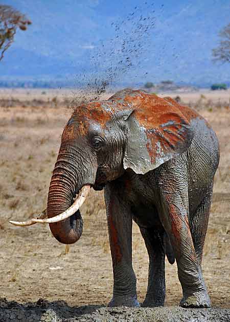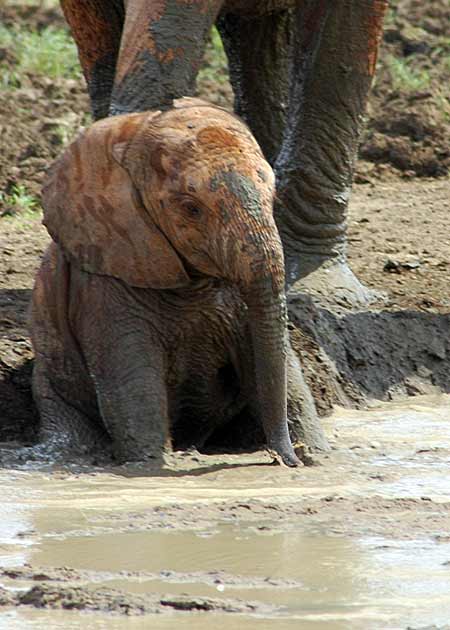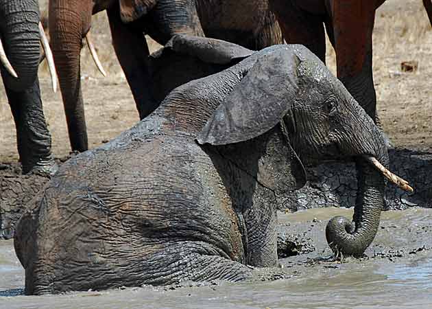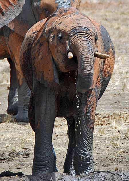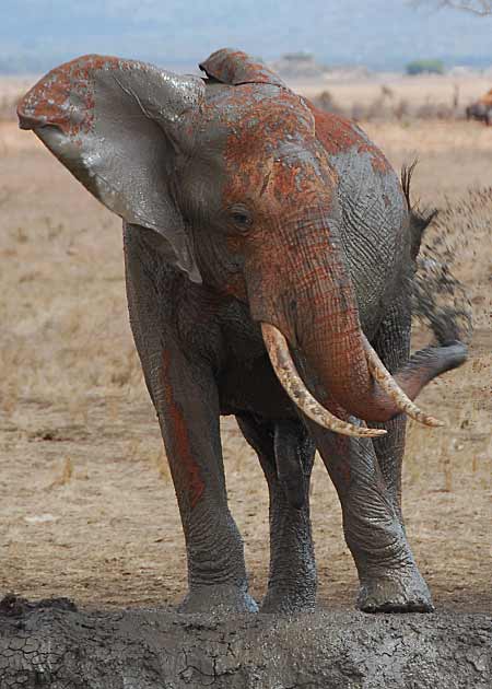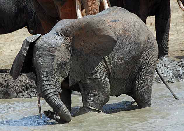 Eventually, the first herd of elephants also arrived at the watering hole. The family groups don’t mix, so the smaller herd moved off when the others arrived. Old Auntie got her nose all out of joint again. This time she was a little more demonstrative in her displeasure, so we backed away a little, and she calmed down. The herd moved around to the far side of the watering hole, giving us great photo ops with full frontal shots. We must have clicked off 2,000 exposures as we watched the elephants cavorting around the water. The newborns were slipping and falling in the muck, the older ones sprayed themselves with thick mud. Every once in a while one of the family would snort and trumpet. We hung out with the herd for more than an hour.