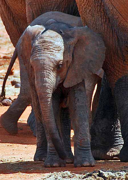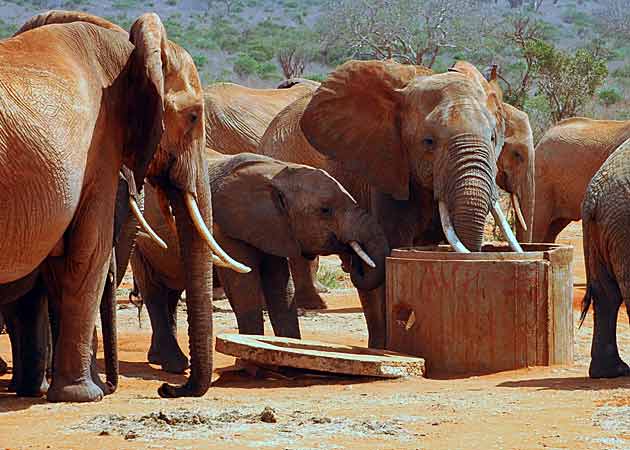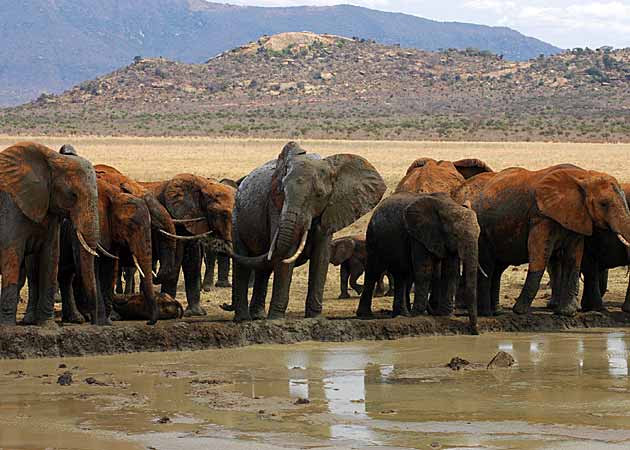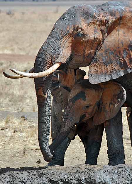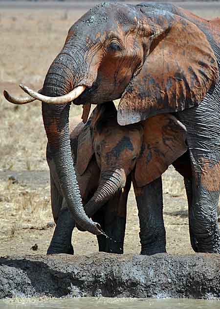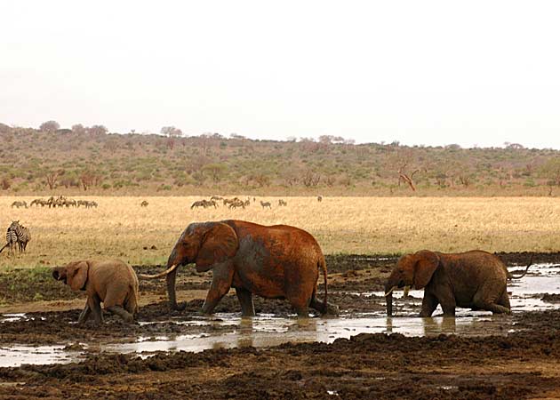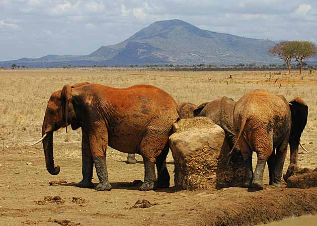 We drove from Tsavo West National Park to Tsavo East National Park(http://en.wikipedia.org/wiki/Tsavo_East_National_Park) this morning. The four hour drive took us from the dramatic cinder cone vistas of extinct volcanos, including Kilimanjaro, to the more familiar savanna and woodlands of East Africa. The climate was noticeably hotter and drier.