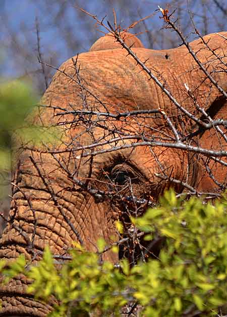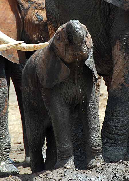 Now, those readers who don’t like Elephants might as well skip the rest of this post because the rest of the day was all-ele. We drove to a concrete cistern where a herd of about 20 elephants were drinking. The herd included three or four calves that were only days old. Patrick rolled the truck to within 15 feet of the elephants and killed the engine. A few of the older females took notice of us, but didn’t make any aggressive moves in spite of the young calves. They lifted their heads and flapped their ears, but didn’t come any closer to the truck or start charging. Eventually, the elephants had enough water, and one by one began to file around the truck, heading up the road from which we had come. We had elephants behind us, beside us, and in front of us. We felt as if we were part of the herd.