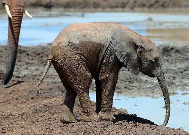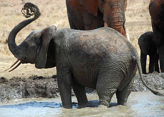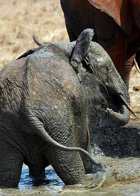 After only a few hundred meters we came upon a watering hole right next to the road with a smaller herd of elephants. We stopped to take some photographs and watch them splashing in the mud.