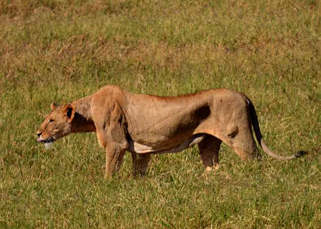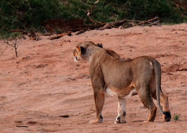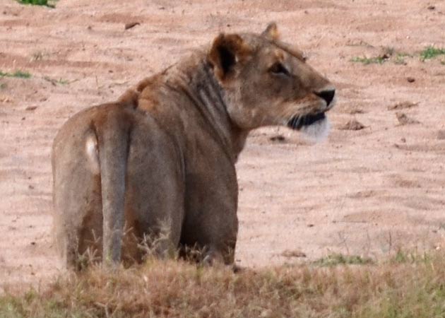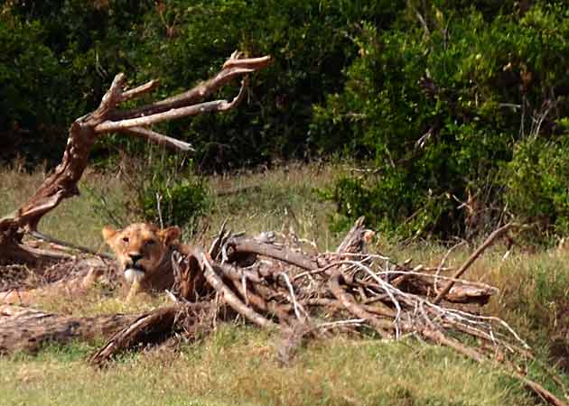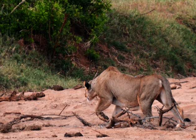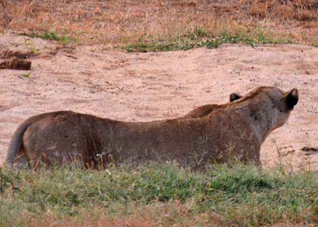 However, the high-point was watching a solo Lioness stalk a small group of gazelles. While she didn’t have her toe-shoes and tutu on, she was definitely on tippy-toes as she slunk across the open savannah. She dipped down into a dry river bed, using it to get closer to her prey. We watched her emerge ever so slowly from the gully, a millimetre at a time, using fallen trees and small bushes for cover.