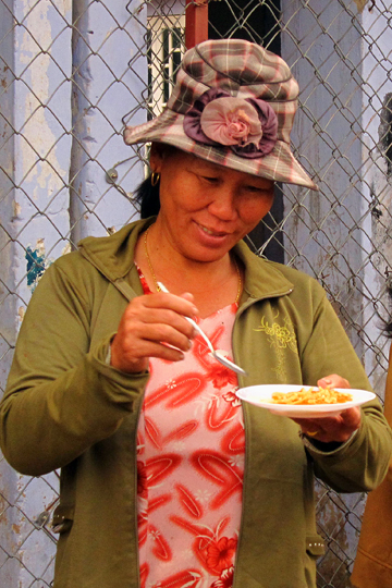 Serving shrimp-sauce on rice rolls, fishing village near Hoi An.