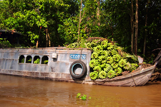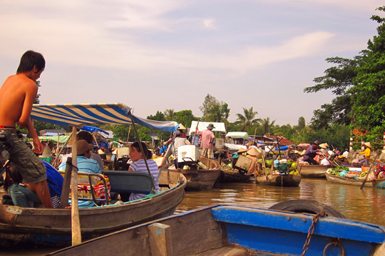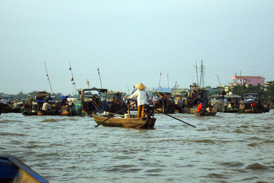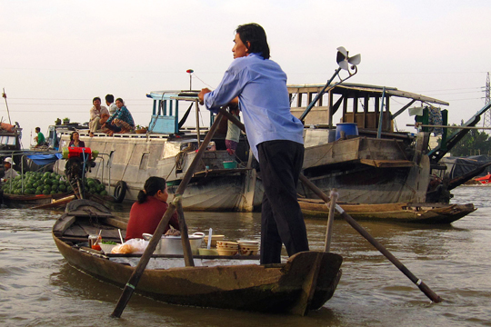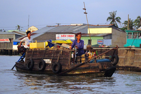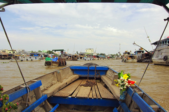 We were told that an, “absolute must-see”, on the Mekong was the Cai Rang Floating Market (http://www.vietnam-beauty.com/top-destinations/223-get-to-know-cai-rang-floating-market-.html). It was everything it was promised to be and more. It was an incredible cacophony of jumbled sights, sounds, and smells… it was a kaleidoscope for the senses. As we approached the market, all we saw was what appeared to be a random, teeming mass of boats with other boats entering and leaving this “glob” without rhyme or reason.  When we got closer, there appeared a certain order in the apparent chaos. The larger of the vessels seemed to form channels for the smaller boats to travel and the vendors each had a pole visible high above their boat – at the top of the pole hung a sample of their wares. Being on a small sampan, Long maneuvered us between the larger boats and right into the heart of the market.
