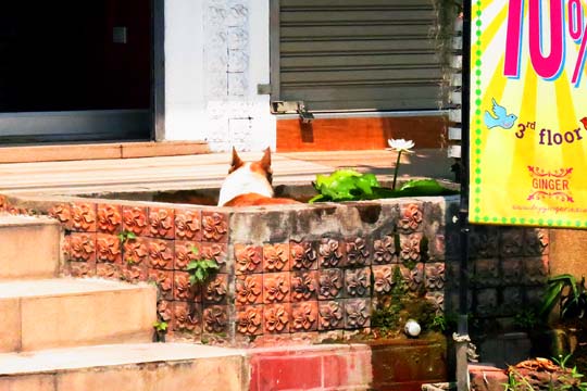 There were a few other places we wanted to visit but being a Sunday, the ones we checked on were closed. Besides, it was around 100 Degrees Fahrenheit (about 35 Degrees Celsius) and melting-into-your-socks-muggy. So, after a nice Mango smoothie in an out of the way cafe, we heeded the siren call of the Great Buddhaire, “Air-Con” and headed back to the Yindee. Along the way we spotted a dog trying to cool himself in a tiny Koi Pond in front of a store. You know it’s hot when…