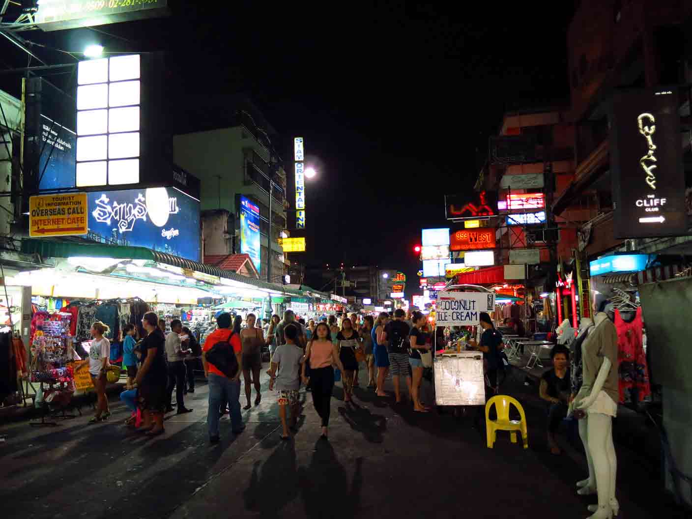 There were the expected multitude of choices for tattoo shops, vendors selling cheap souvenirs, street-food carts, and even a bar featuring Lady-boys singing karaoke; the surprise was the 7 Eleven stores. Bangkok itself must have more 7 Elevens than Canada and the US combined but on Khao San Road (on just two blocks or so) they have three… two of them directly across the road from each other.