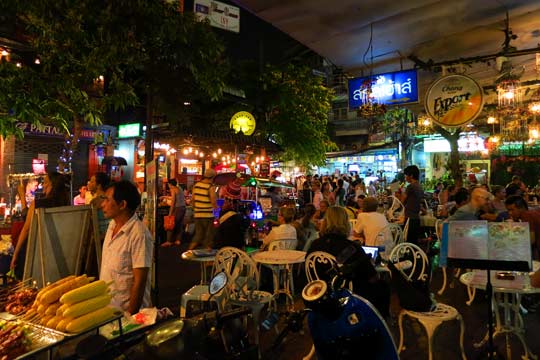 The sounds and aromas coming from the street-food vendors had been driving us over the edge. So, time to find dinner. Tonight it was the restaurant that flows across the bottom floor of Sawasdee House (http://www.tripadvisor.com/Hotel_Review-g293916-d1389648-Reviews-Sawasdee_House-Bangkok.html) and spills across to straddle the road in front of the hotel. It was a great location for people-watching and the food was pretty good as well… although you definitely pay Farang-prices.