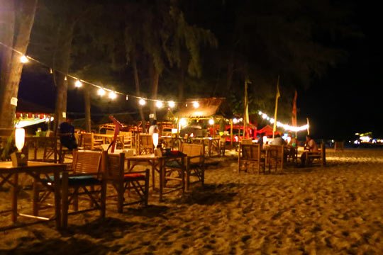 After showering off, we walked back to the beach and found San’s Sunset Bar (just north of where we had our butts planted). The food was “average” but the beach ambiance was very relaxing. My only suggestions to them would be to improve the complexity of flavours in their food and to tone-down the bass on the hip hop they had playing. In fact, just trash the hip hop and play some island-themed tunage. The boomy angry-young-man-stuff may have been okay for the college-crowd but, most of this evening’s patrons were couples or small groups of 30+ types. And they also include a “fire show”. We’re not really sure what part of Koh Lantian culture twirling flaming batons in front of slightly bemused Farang restaurant customers represents, but they had a fire show anyway.
