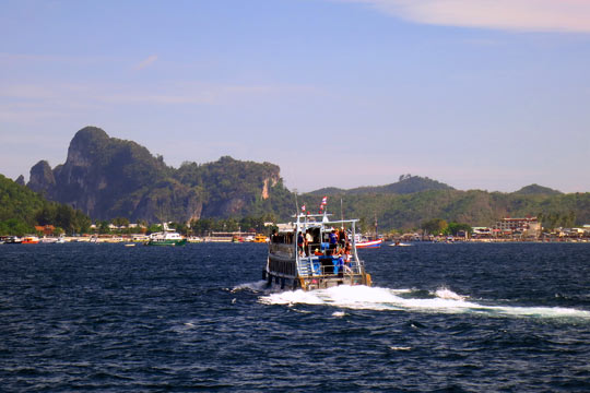 Our tuk-tuk pulls up just before 8 AM, we load up, say our Thanks and goodbyes, and off we go. Luckily, Koh Lanta doesn’t have any morning rush… or much traffic at all on a Sunday morning. So, the drive was hassle-free. On arriving at the terminal, we discover that the smallest denomination bill we had was a 500 Baht note; the ride is usually only 100 Baht and the driver didn’t have enough change that early in the day. Understanding our rush, he graciously declined any payment… Eron and I looked at each other and agreed, that kind of “nice” needed to be rewarded, if only for the benefit of our own Karma. I had to physically press the 500 Baht note into the driver’s hand; all the while him saying, “No, no, it’s too much.” The ferry was just loading the last of the passengers as we rolled up… now, the next roadblock. We walk up to the lady at the check-in kiosk and are told we needed a physical print-out of the confirmation and not just the confirmation number on a saved page on Eron’s iPad. She points out a travel-booking counter and says they’ll print it for us. We head over there to find out they’ll print it, but for a 20 Baht fee. Remember, earlier I didn’t have anything smaller than a 500 Baht note? Now, my smallest was a 1000 Baht note. I dug through my pockets and all I could come up with was 18 Baht in coins; luckily the guy at the counter took pity on us and accepted it as payment. With print-out in hand, we rush back to the check-in just in time to load onto the ferry. Oh yeah, we also find out that the “direct” ferry passage we booked actually involved a transfer to another vessel at Koh Phi Phi. So far, the events of the morning had definitely eaten into our banked “relaxed-time” but except for the ferry company’s screw-up with the taxi, we still left Koh Lanta with warm feeling for it’s residents. They, especially the owner of the resort and the tuk-tuk driver, really went to the next level of service in trying to help out two mildly stressed-out travellers.