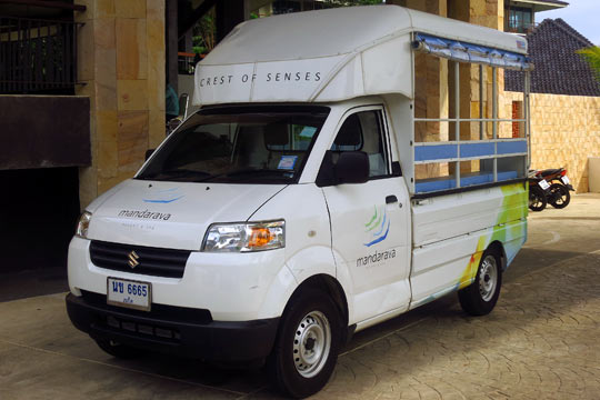 We arrived before our room was available. So, we had lunch in the resort’s main restaurant. After eating, our room was ready. The Bellhop loaded us and our luggage into the cargo/people compartment of one of the tiny Suzuki trucks the resort uses as shuttles and he drove us up the hill to our room. When I say, drove us up, I mean UP… as in over 60 degrees up at points… it felt like we were in one of those little kiddie roller-coaster rides. On some of the steeper pitches, we instinctively hung on to stop ourselves from sliding out the open rear of the truck… good thing the truck has really low gearing.