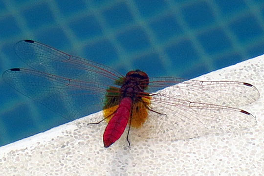 Some of our constant-companions at the pool were a bunch of beautiful Dragonflies. They are a stunning vermillion and they flew in intricate patterns above the water sometimes landing on the edge of the pool to rest.