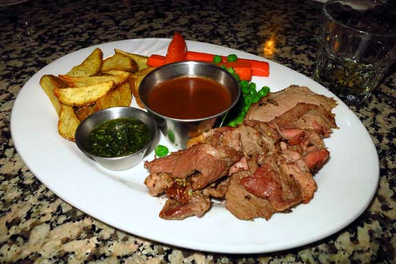 For the Roast Lamb main course, the chef roasted lamb shoulders to perfection. The meat was fork-tender, seasoned perfectly, had just the right hint of gameness, and was not “fatty” in the least. The lamb was accompanied by well-prepared carrots and green peas (both with just the right amount of firmness remaining), a rich brown gravy, and some of the best roasted baby potatoes I’ve had. However, the real surprise was the mint sauce; it was completely made in-house and was wonderfully fresh and absolutely bursting with minty flavour.