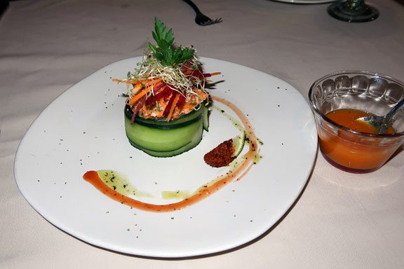 My choice for entree this evening was Culi’s Pan-Seared Tuna with a Wasabi-Soy Reduction. I have been looking forward to trying this dish since April; at that time they lacked fresh-caught local tuna and couldn’t serve it. Erik told me that the tuna was available and very fresh. So, I had to go for it.