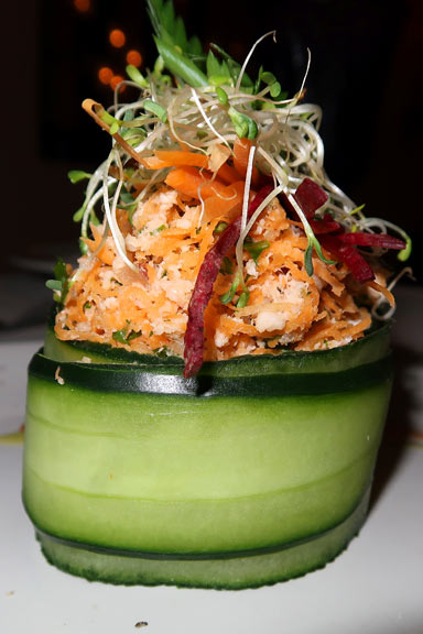The presentation was beautiful; literally a feast for the eyes. Two large pieces of tuna (easily enough to share between two) on top of grilled vegetables. Garnished with grilled Star Fruit and deep-fried vermicelli. And drizzled with their wasabi-soy reduction sauce. The Star Fruit was a pleasant surprise. Normally, I find it to be quite tart but once grilled, it was mildly sweet but very “crunchy”. The muted flavour of the fruit becomes lost against the robustness of the sauce but the crunch is a terrific counter-point to the firm texture of the fresh tuna. The Wasabi-Soy Reduction was a fantastic accompaniment to the tuna. It was not overwhelmingly salty, had a very satisfying “meaty” Umami savoriness, and carried a tantalizing hint of (we believe) Cumin. The vegetables also deserve some mention. There were slices of zucchini, julienned carrots, green beans, and wilted spinach. Except for the spinach (and rightfully so), the vegetables were all crisp had snap. For those who enjoy their tuna rare, this dish will be a memorable treat.