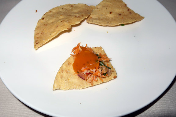 The first dish to arrive was Culi’s complimentary Ceviche. It has been served to us in a different artistic presentation on each visit. However, while the presentation varies, their Ceviche remains one of our favourites; tangy but not overpoweringly limey, moist without being sloppy-wet, and full of texture and flavour. It is served with crispy tortillas, dry flat-toast, and a spicy Habanero salsa.